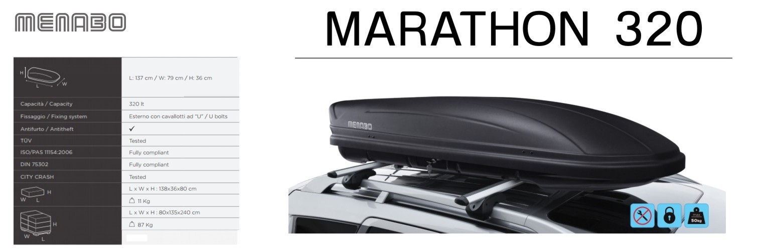 Baule da tetto funzionale per qualsiasi esigenza. Fissaggio tradizionale alla barre per mezzo dei cavallotti max 60×40. Dotato di serratura con chiusura a due punti. Superficie ruvida, colore nero opaco. L. mm = 1370, H mm = 360, W mm = 790 —box auto