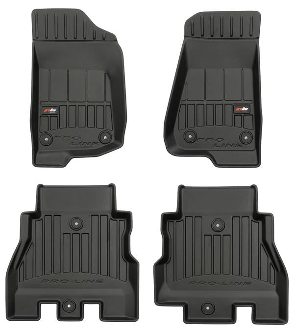 Serie completa tappeti anteriori e posteriori realizzati in TPE UltraFlex Dual Polymer, provvisti di bordi alti fino a 7 cm. Con poggia-piede sul lato guida e bottoni di fissaggio a scatto.